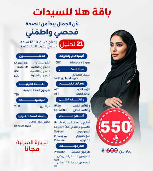اعتنِ بصحتك اليوم، ولا تؤجل فحوصاتك! إجرِ فحوصاتك المخبرية بكل يسر وثقة في مختبر رها الطبي بالرياض، حيث الجودة العالية والتقنيات الحديثة لضمان نتائج دقيقة في أسرع وقت. مع إمكانية سحب العينات في راحة منزلك دون عناء التنقل أو الانتظار، ومع تقييم أولي شامل يشمل قراءة التقرير الطبي وتوصيات الطبيب المختص قبل بدء الرعاية.